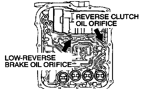 2. Blow 108 kPa (15 psi) compressed air into the reverse clutch oil orifice of the transaxle case, and check if the reverse clutch piston moves and air pressures are maintained in that condition. Repeat for the low-reverse brake.