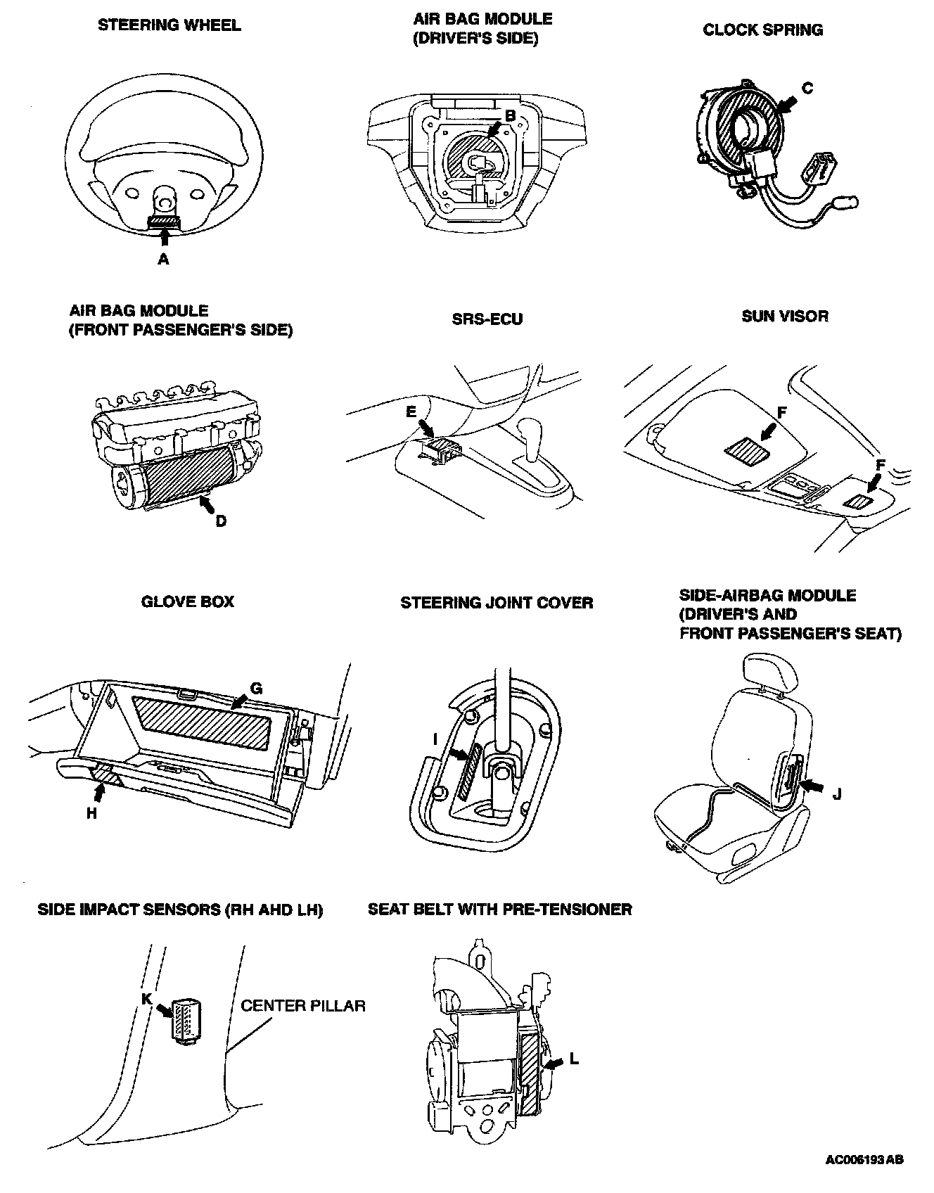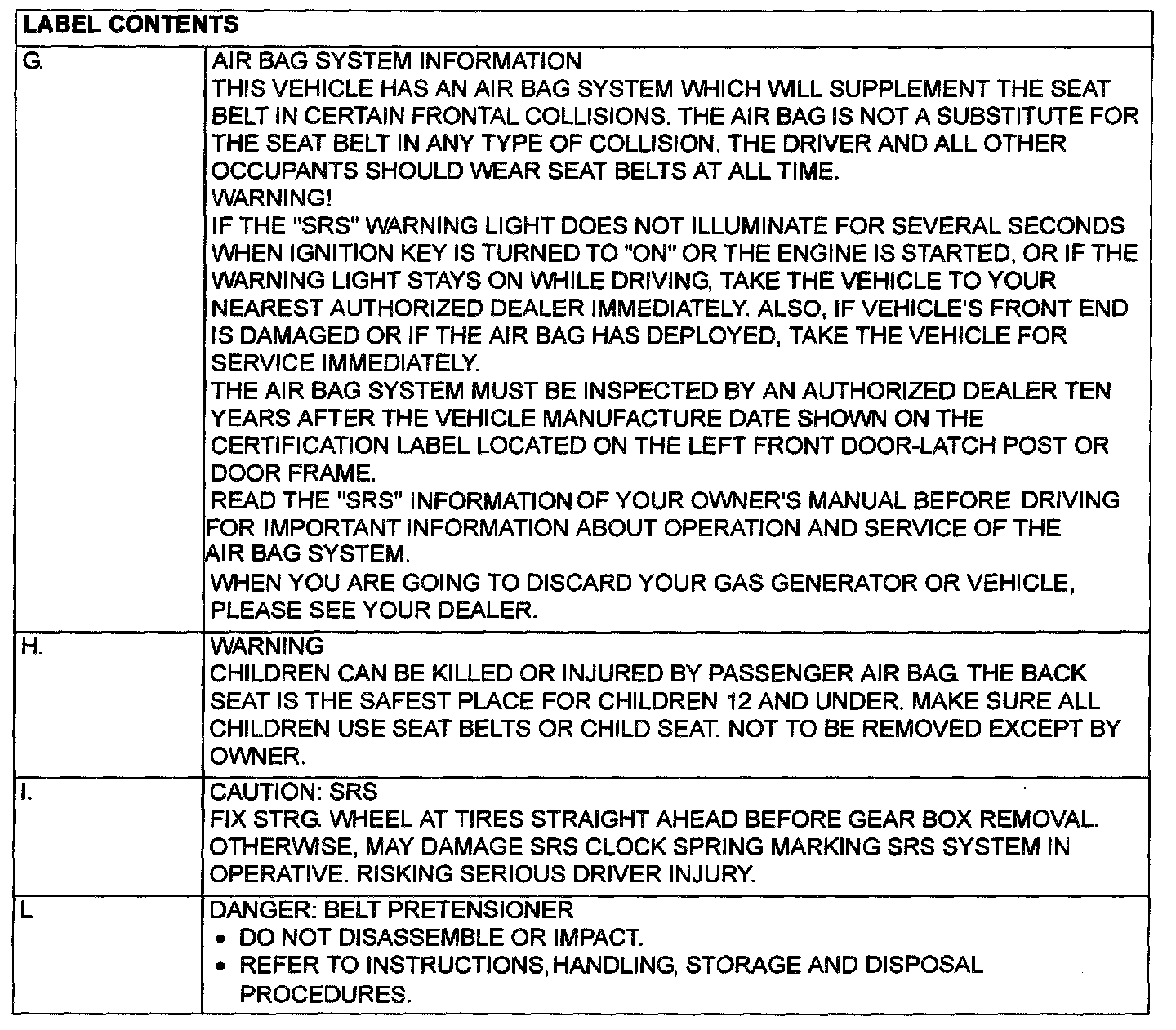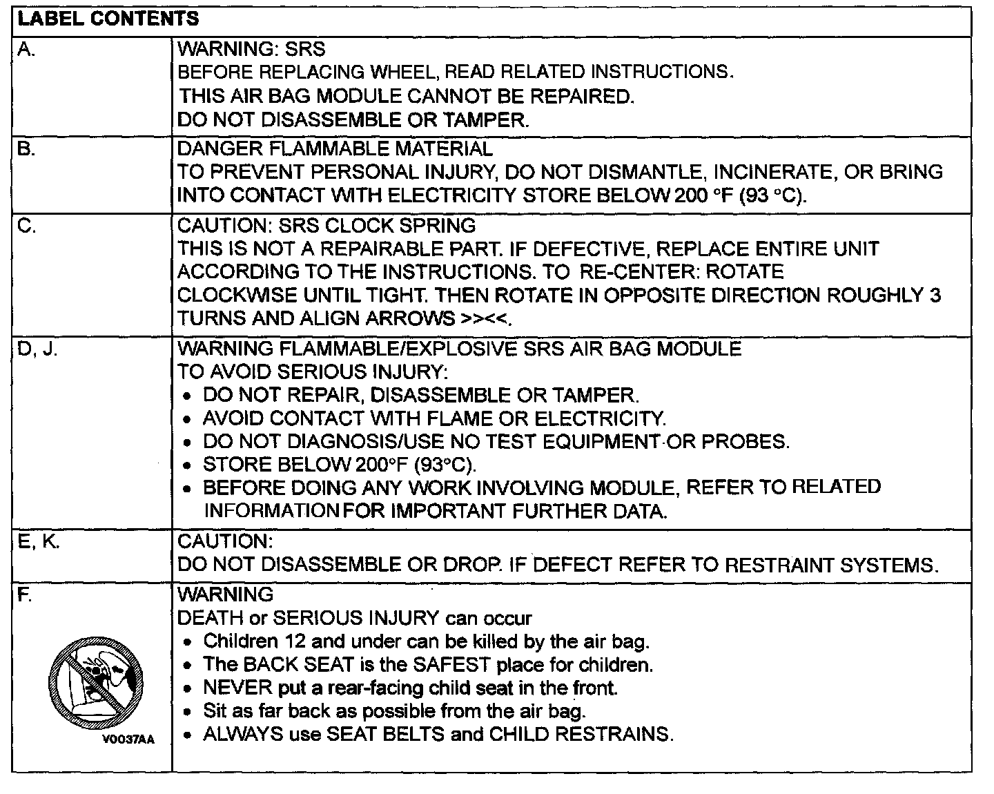 A number of caution labels related to the SRS are found in the vehicle, as shown in the illustration. Follow label instructions when servicing SRS. The label H is not to be removed except by owner. If the other labels are dirty or damaged, replace them.