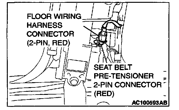 NOTE: If the seat belt pre-tensioner connector is disconnected from the floor wiring harness, both electrodes of the seat belt pre-tensioner connector will be automatically shorted to prevent unintended operation of the seat belt pretensioner due to static electricity, etc.