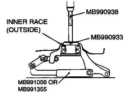3. Install the inner race (outside) that was removed from the hub to the wheel bearing, and then use special tools MB990933, MB990938, MB991056 or MB991355 to remove the wheel bearing.