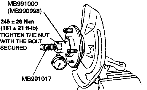 1. Tighten special tools MB991000 (MB990998) and MB991017 to the specified torque, and then press the hub into the knuckle.