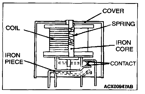 1. When current flows through the coil of a relay, its core is magnetized to attract the iron piece, closing (ON) the contact at the tip of the iron piece. When the coil current is turned off, the iron piece returns to its original position by a spring, opening the contact (OFF).