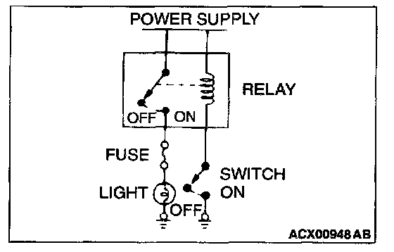 2. By using a relay, a heavy current can be turned on and off by a switch using much less current. For example, in the circuit shown here, when the switch is turned on (closed), current flows to the coil of the relay. Then, its contact is turned on (closed) and the light comes on. The current flowing through the switch is much less than that for the light.