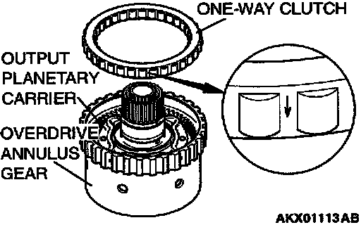 Insert the one-way clutch into the overdrive annulus gear so that the arrow points towards the output planetary carrier.
