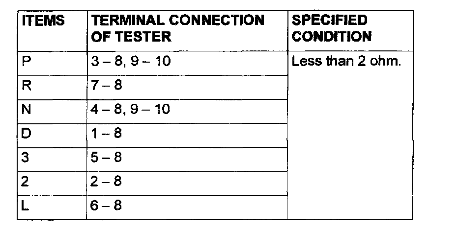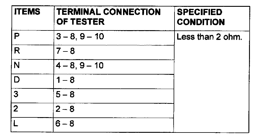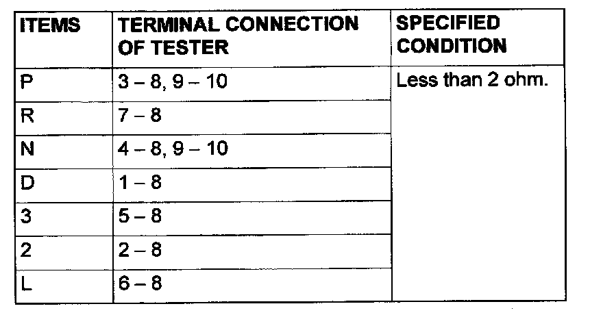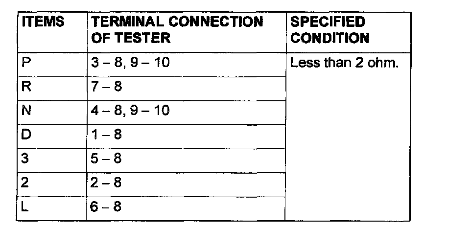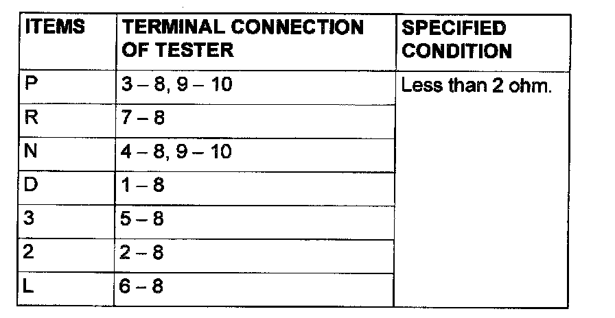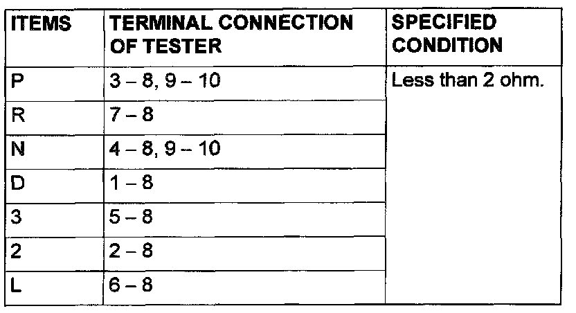 STEP 11. Check the Park/Neutral position switch. Check for continuity between terminals for each selector position.