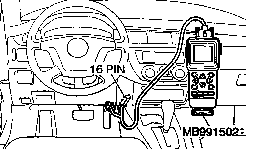 CAUTION: To prevent damage to scan tool MB991502, always turn the ignition switch to the "LOCK" (OFF) position before connecting or disconnecting scan tool MB991502.