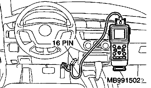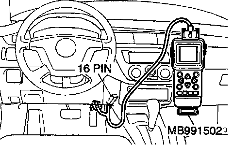 CAUTION: To prevent damage to scan tool MB991502, always turn the ignition switch to "LOCK" (OFF) position before connecting or disconnecting scan tool MB991502.