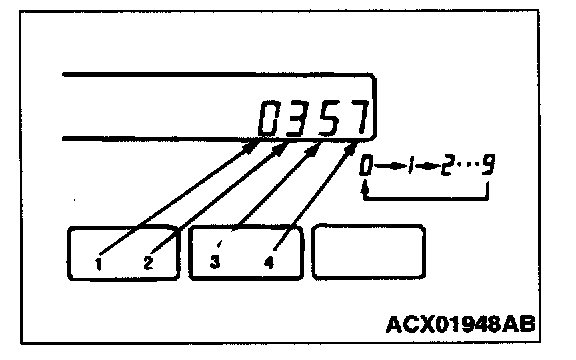 5. Press number 1 through number 4 memory select button to set the four-digit security code shown on the card. Every time each digit key is pressed, the figure changes as follows: 0 to 1 to 2 to 3 to 4 to 5 to 6 to 7 to 8 to 9 to 0