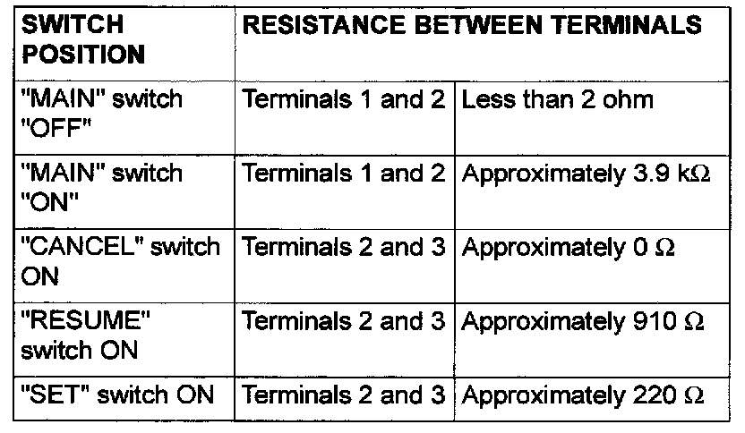 Measure the resistance between the terminals when each of the "SET" "RESUME" "CANCEL" and "MAIN" switches is pressed. If the values measured at the time correspond to those in the table, the resistance values are correct.
