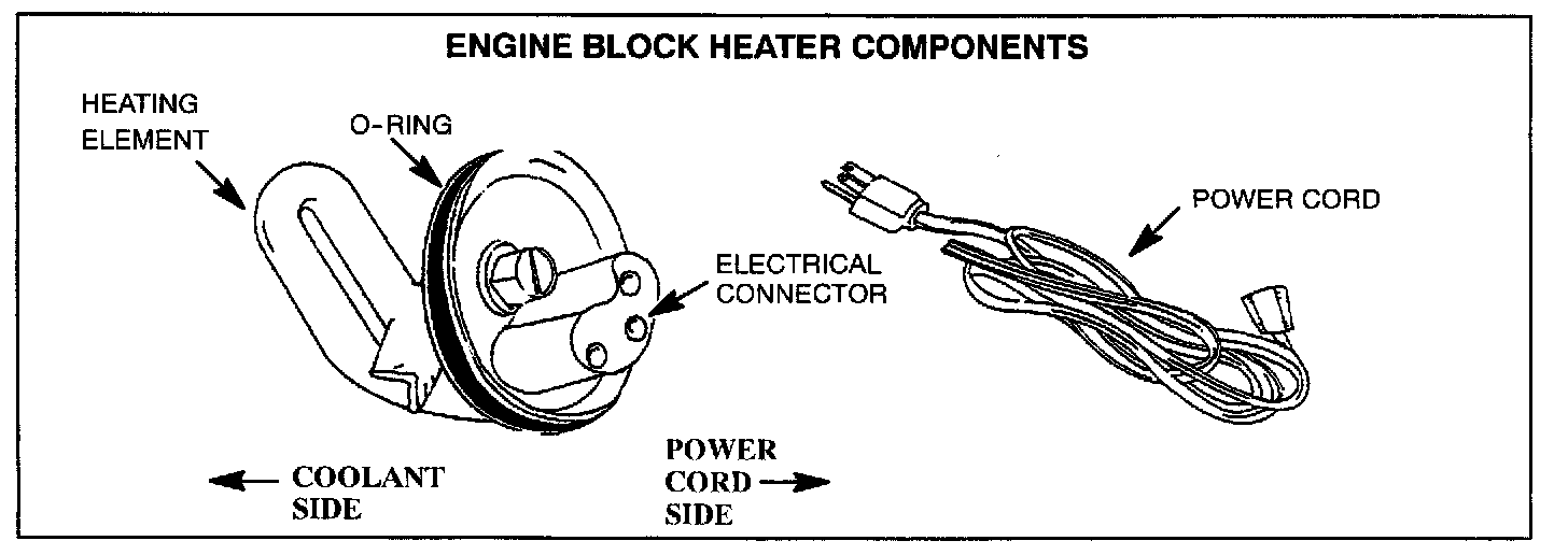 Engine block heaters are used to maintain coolant fluidity inside the engine's coolant passages. Coolant fluidity is a factor when vehicles are parked in extremely cold areas (0°F or less) for extended periods of time. A block heater consists of a heating element, 0-ring, electrical connector, and a power cord.