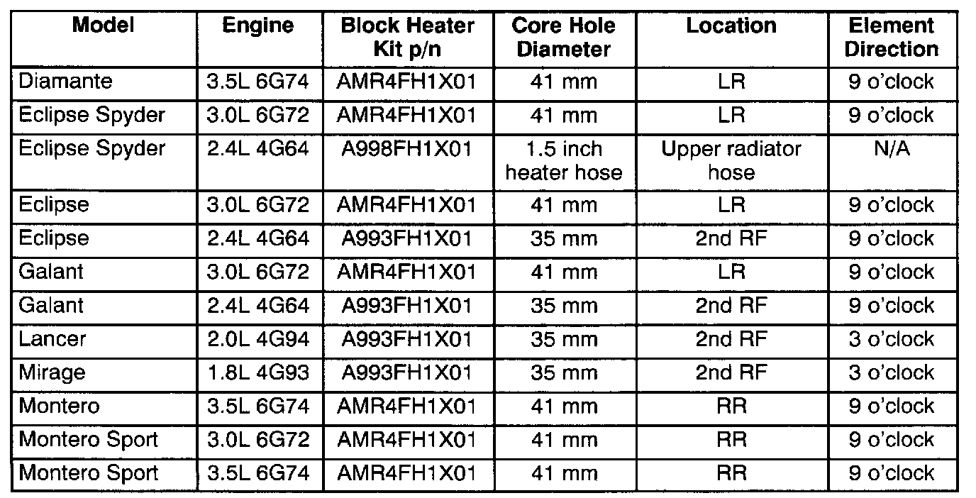 This bulletin provides specific vehicle application and general information on engine block heaters. The chart in the PARTS INFORMATION section identifies the appropriate block heater kit, installation location, and positioning direction for 2002 model vehicles. Refer to TSB-01-11-002 for block heater information for 1983-2001 models.