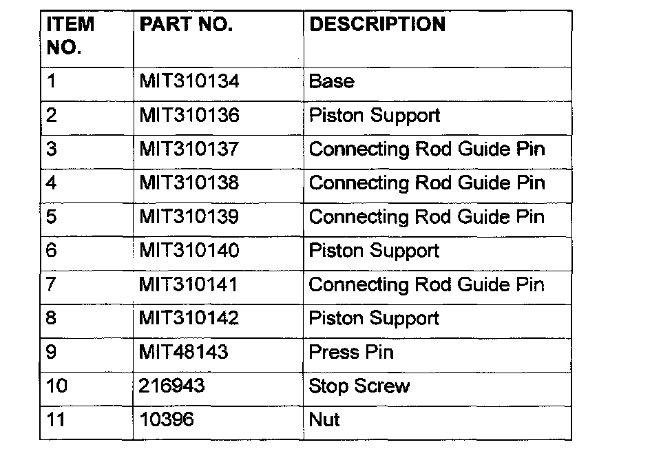 1. Thread the stop screw and lock nut assembly into the base. Fit the correct piston support on top of the base. Insert the press pin, threaded end up, into the hole in the piston support until the press pin touches the stop screw.