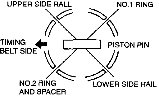 2. Align the gaps of the piston rings and oil rings (side rails and spacer) as shown.