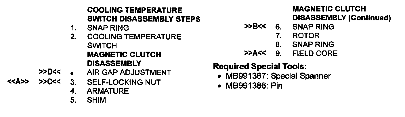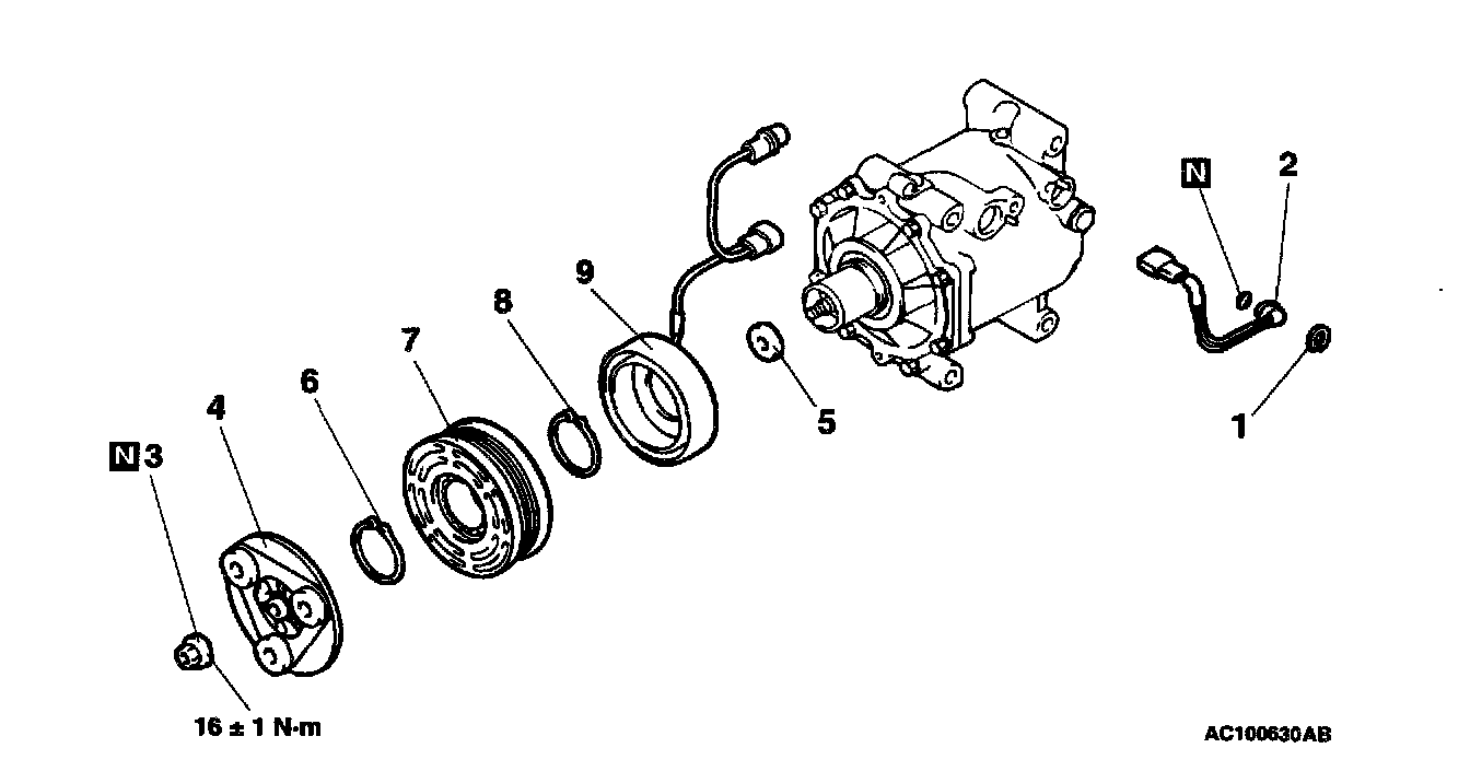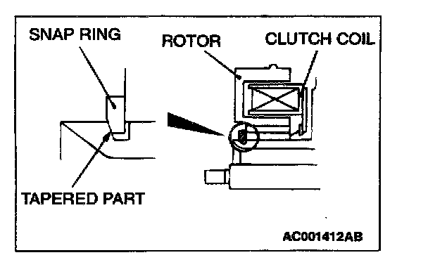 Apply voltage from the battery to the magnetic cliche and check that the clutch air gap is inside the standard value. If outside the standard value, use a shim to adjust the gap.