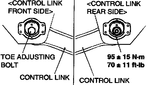 2. Carry out adjustment by turning the toe adjusting bolt (control link mounting bolt which is located on the inner side of the body).