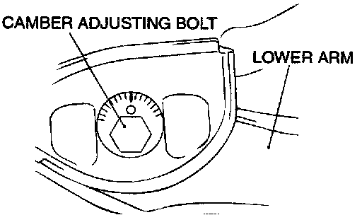 2. Carry out adjustment by turning the camber adjusting bolt (lower arm mounting bolt which is located on the inner side of the body).