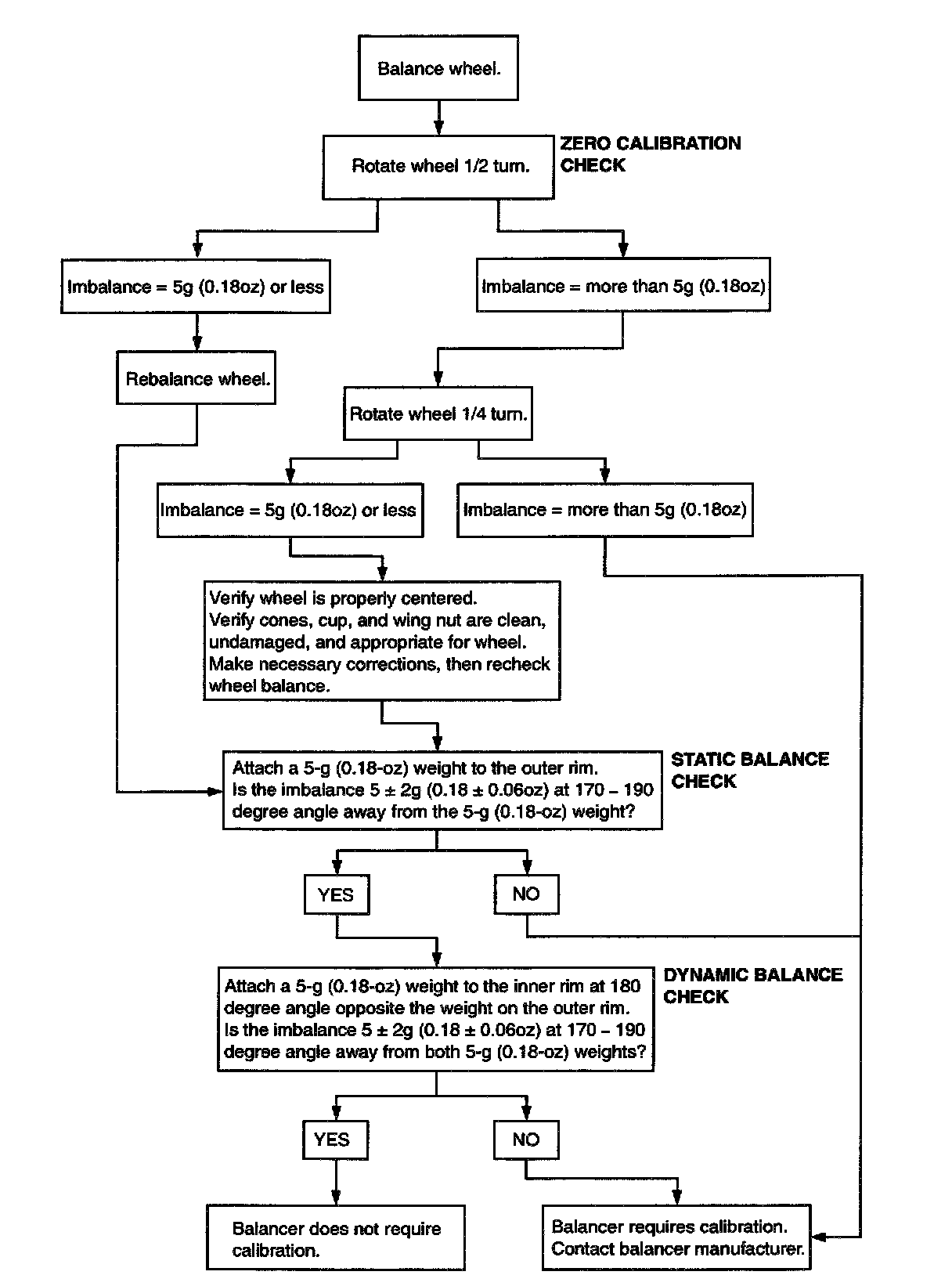 Check your balancer's calibration approximately every 100 balances. Your wheel balancer's instruction manual should include calibration procedures. If the calibration procedures specifically for your balancer are missing, use the generic steps for zero calibration, static balance, and dynamic balance checks. The wheel balancer calibration checks are also described in the flowchart.