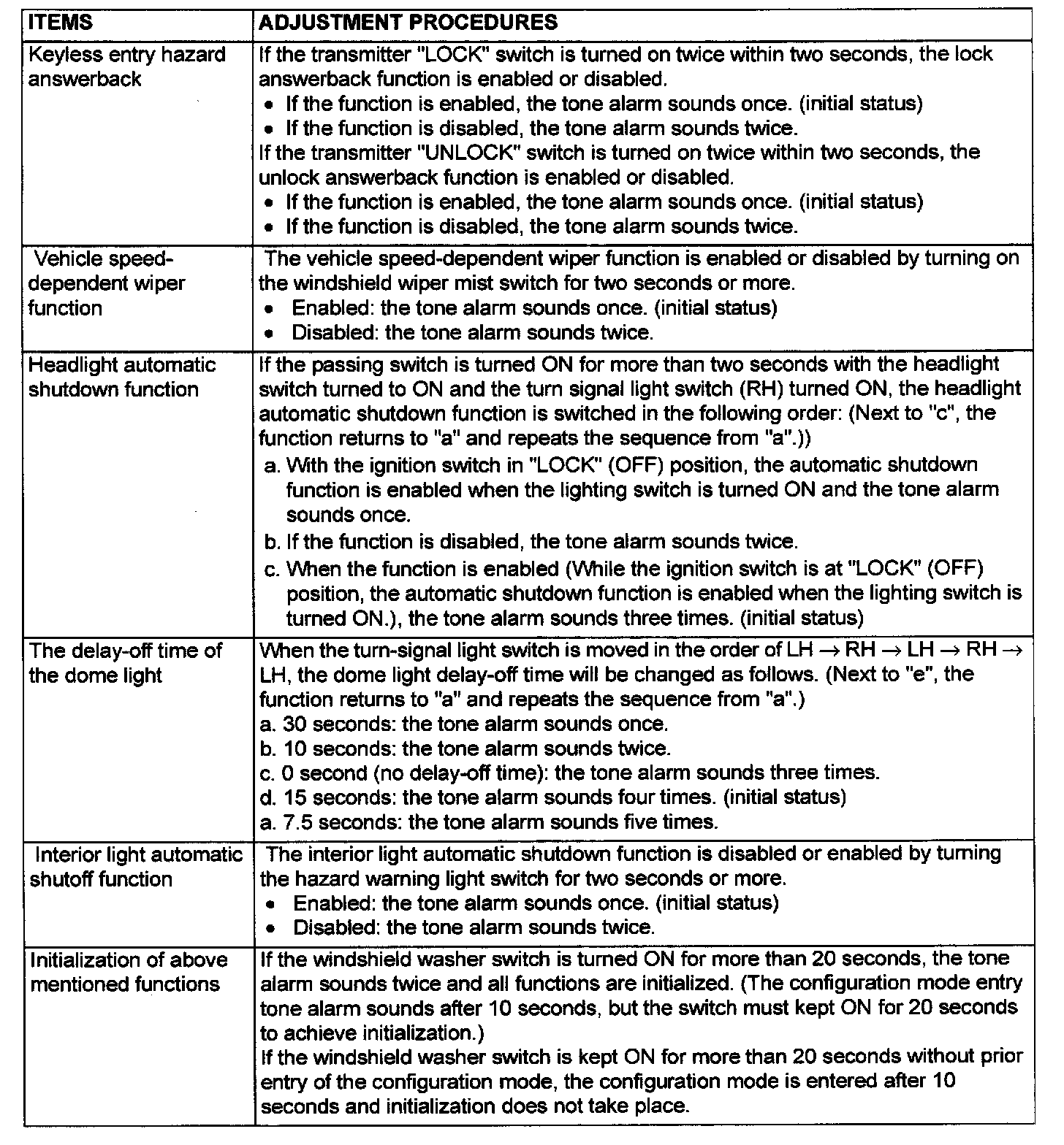 NOTE: The keyless entry hazard answerback can be also adjusted by operating the RKE transmitter, (however, this adjustment can be done more easily by operating the transmitter.) Refer to Keyless Entry System - On- vehicle Service - Enabling/disabling the Answerback Function.