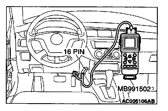 CAUTION: To prevent damage to scan tool MB991502, always turn the ignition switch to the "LOCK" (OFF) position before connecting or disconnecting scan tool MB991502.