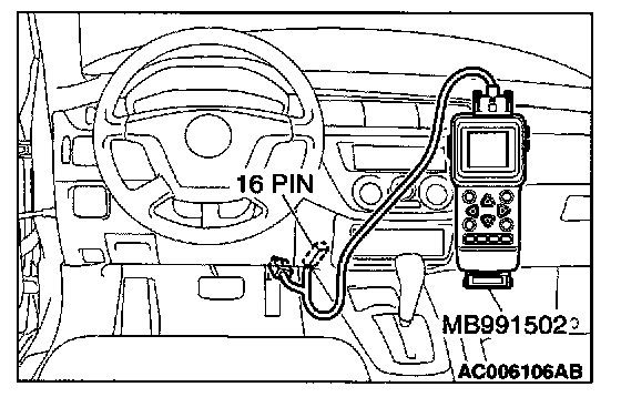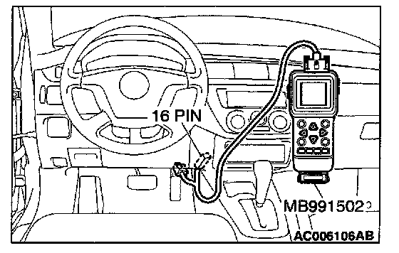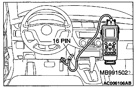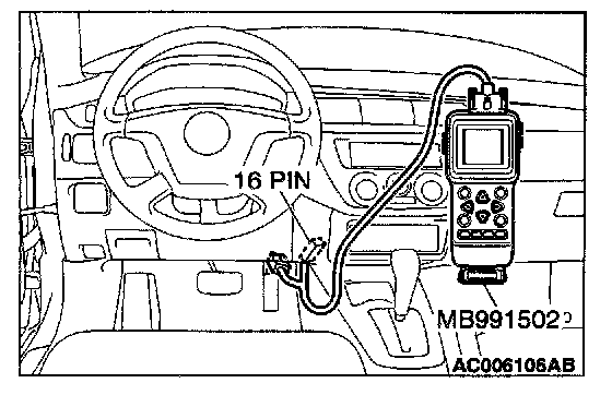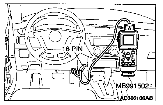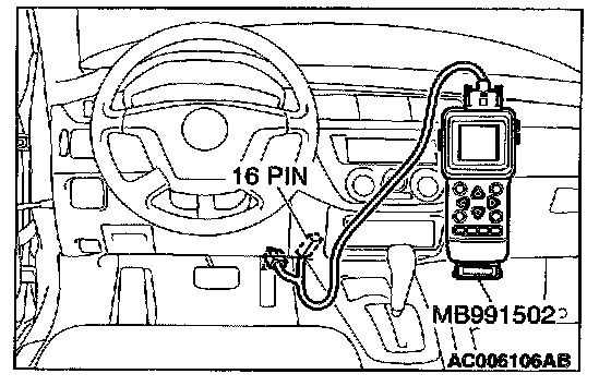 CAUTION: To prevent damage to scan tool MB991502, always turn the ignition switch to the "LOCK" (OFF) position before connecting or disconnecting scan tool MB991502.