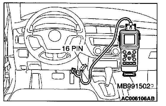 CAUTION: To prevent damage to scan tool MB991502, always turn the ignition switch to the "LOCK" (OFF) position before connecting or disconnecting the scan tool MB991502.