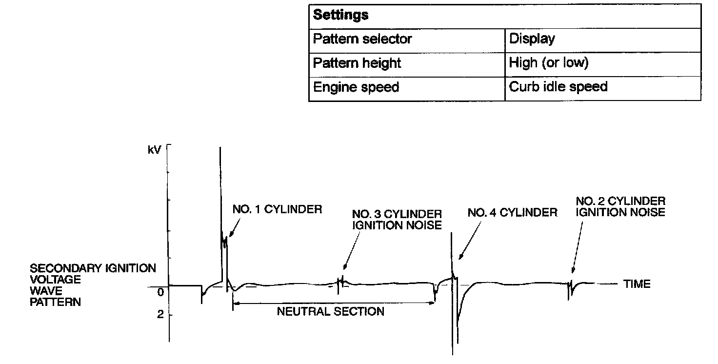 NOTE: Because of the two-cylinder simultaneous ignition system, the waves for two cylinders in each group appear during wave observation. However, wave observation is carried out for the cylinder (Number 1 or 3) with the spark plug cable which has been clamped by the secondary pickup.