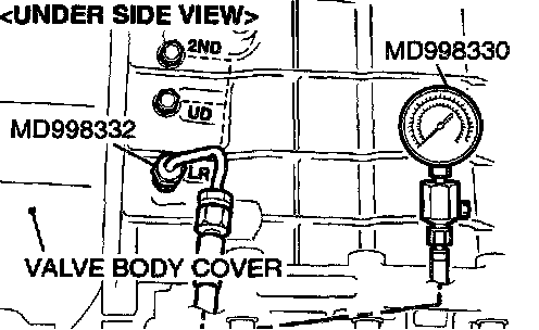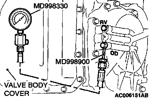 3. Connect the special tools (3.0 MPa (427 psi) oil pressure gauge [MD998330] and adapters [MD998332, MD998900]) to each pressure discharge port.