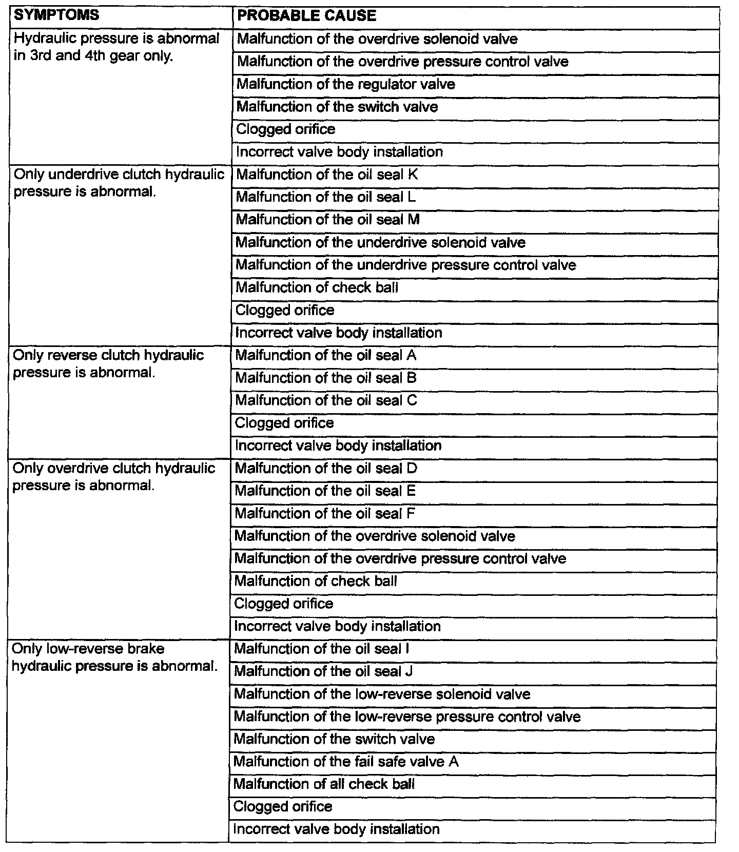 HYDRAULIC PRESSURE TEST DIAGNOSIS TABLE