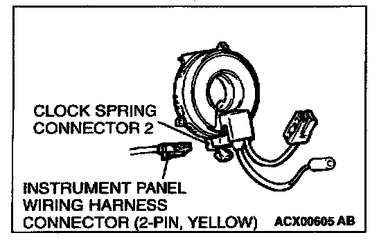 NOTE: If the clock spring connector is disconnected from the instrument panel wiring harness, both electrodes of the clock spring connector will be automatically shorted to prevent unintended deployment of the air bag due to static electricity, etc.