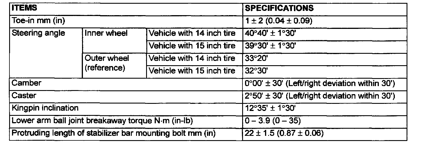 Front Wheel Alignment Specifications