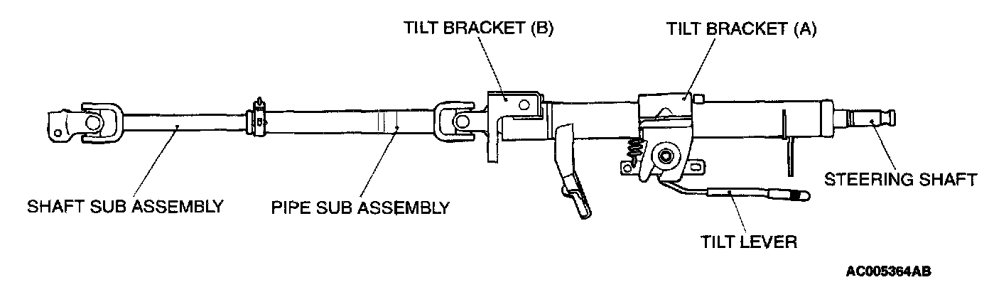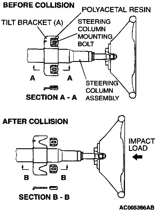 1. When the driver's body falls against the developed air bag, the tilt bracket (A) moves forwards by crushing the polyacetal resin, causing the steering column assembly to move into the engine compartment.