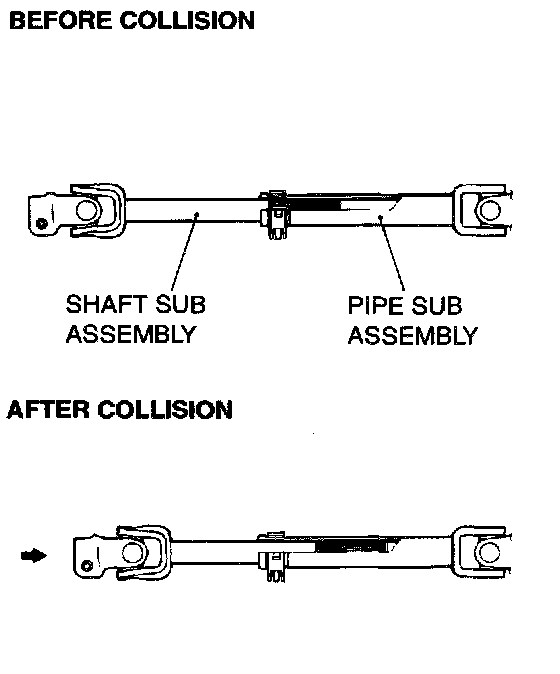 When the vehicle collides with something and there is a load added to the shaft sub assembly from the gearbox, the shaft sub assembly slides above the pipe sub assembly to absorb tie shock load. This prevents the steering column from moving backwards during the impact.