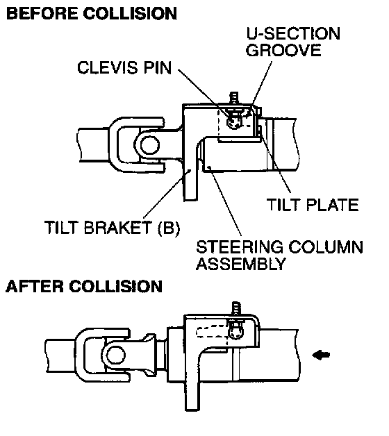 2. As the bracket brakes free, the clevis pin comes out of the U-section groove in the tilt plate, allowing the steering column assembly to move forward.