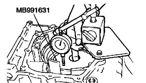 18. Turn the transaxle over so that the installation surface of the torque converter housing is facing up. Install special tool MD998913 in a dial gauge, and then move special tool MB991631 and measure its movement.