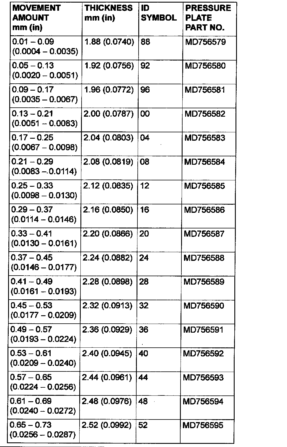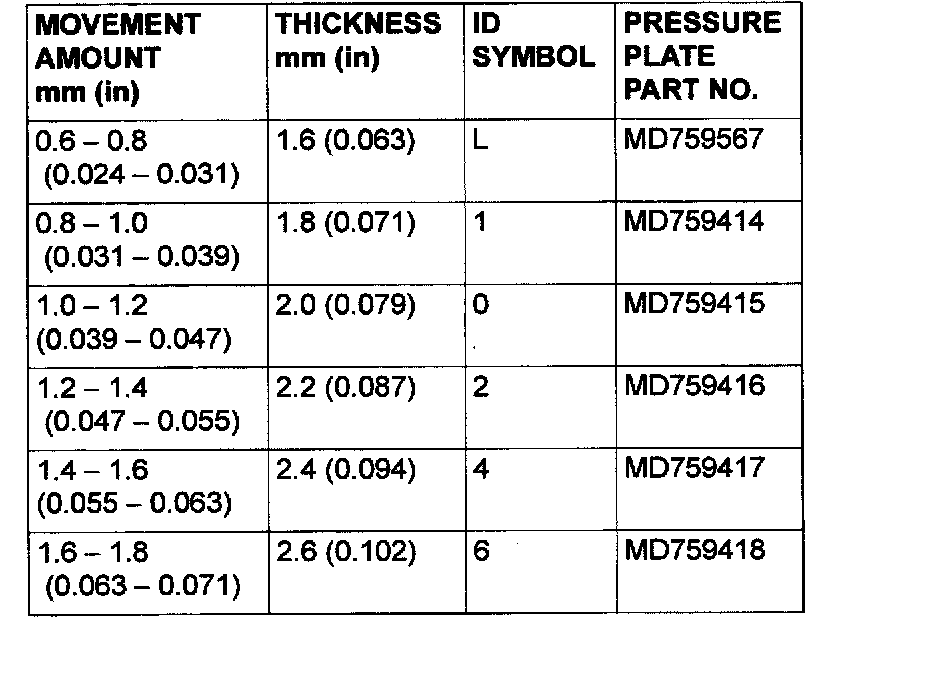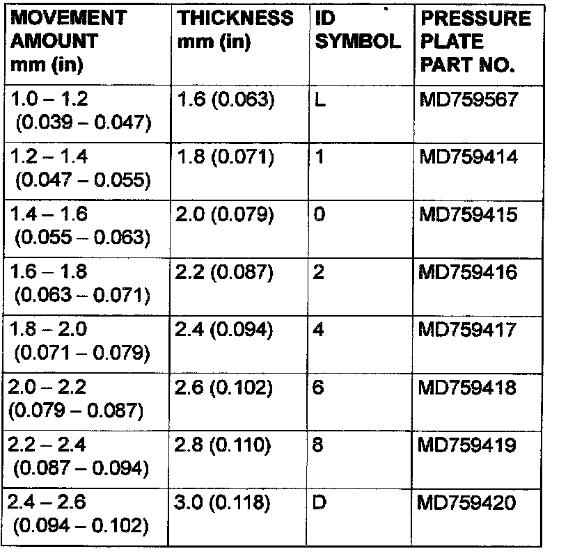 17. Select a pressure plate whose thickness corresponds to the measured amount of movement from the following table.