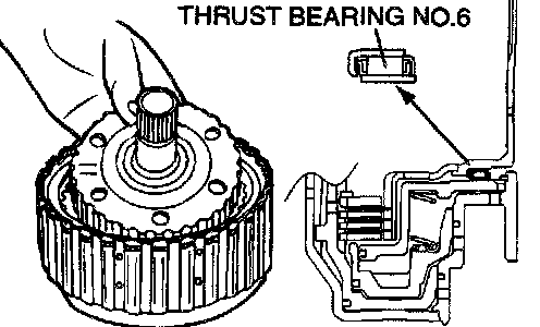 46. Attach thrust bearing number 6 to the inside of the overdrive clutch hub using petroleum jelly (Vaseline). Then install the assembly in the reverse and overdrive clutch.
