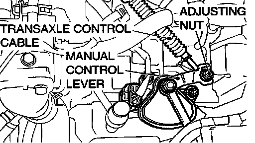 6. Gently pull the transaxle control cable in the direction of the arrow, until the cable is taut. Tighten the adjusting nut.