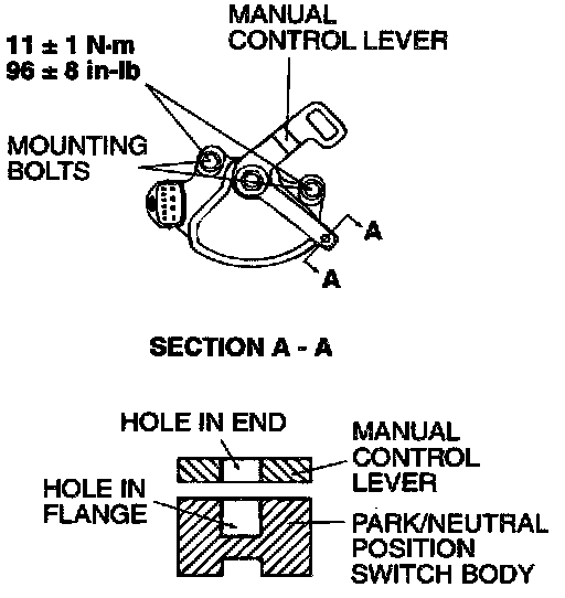NOTE: The Park/Neutral position switch body can be aligned by inserting a mm diameter steel bar into the end hole of the manual control lever and the flange hole of the park/neutral position switch body.