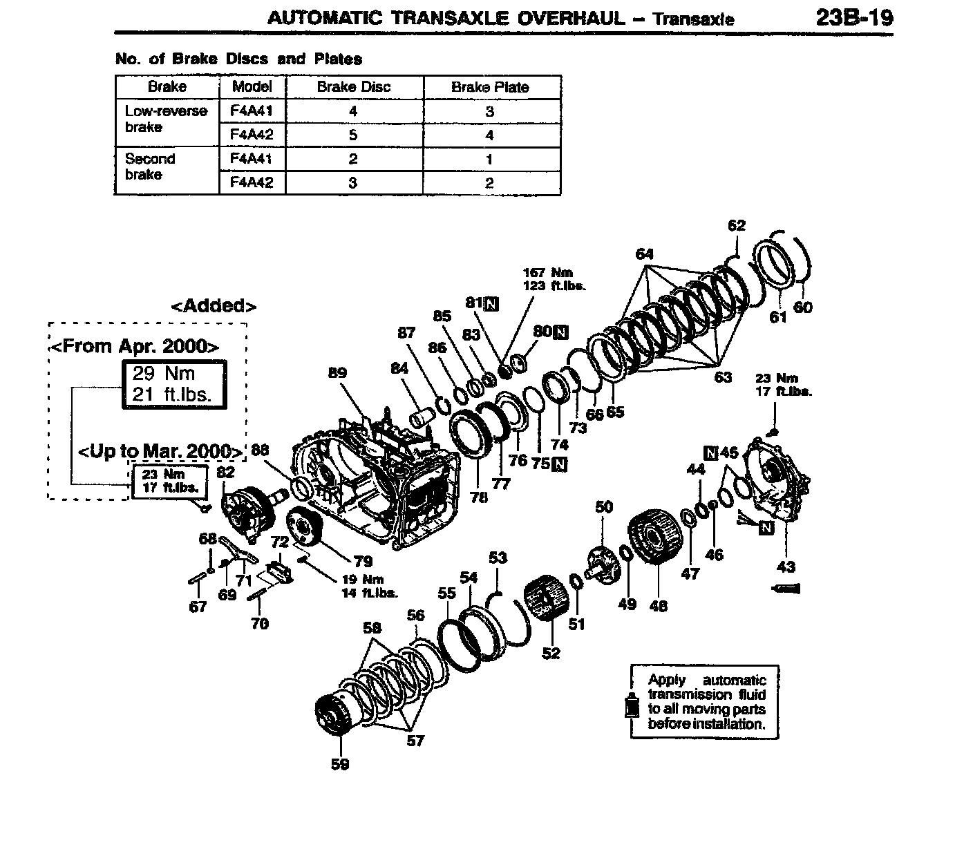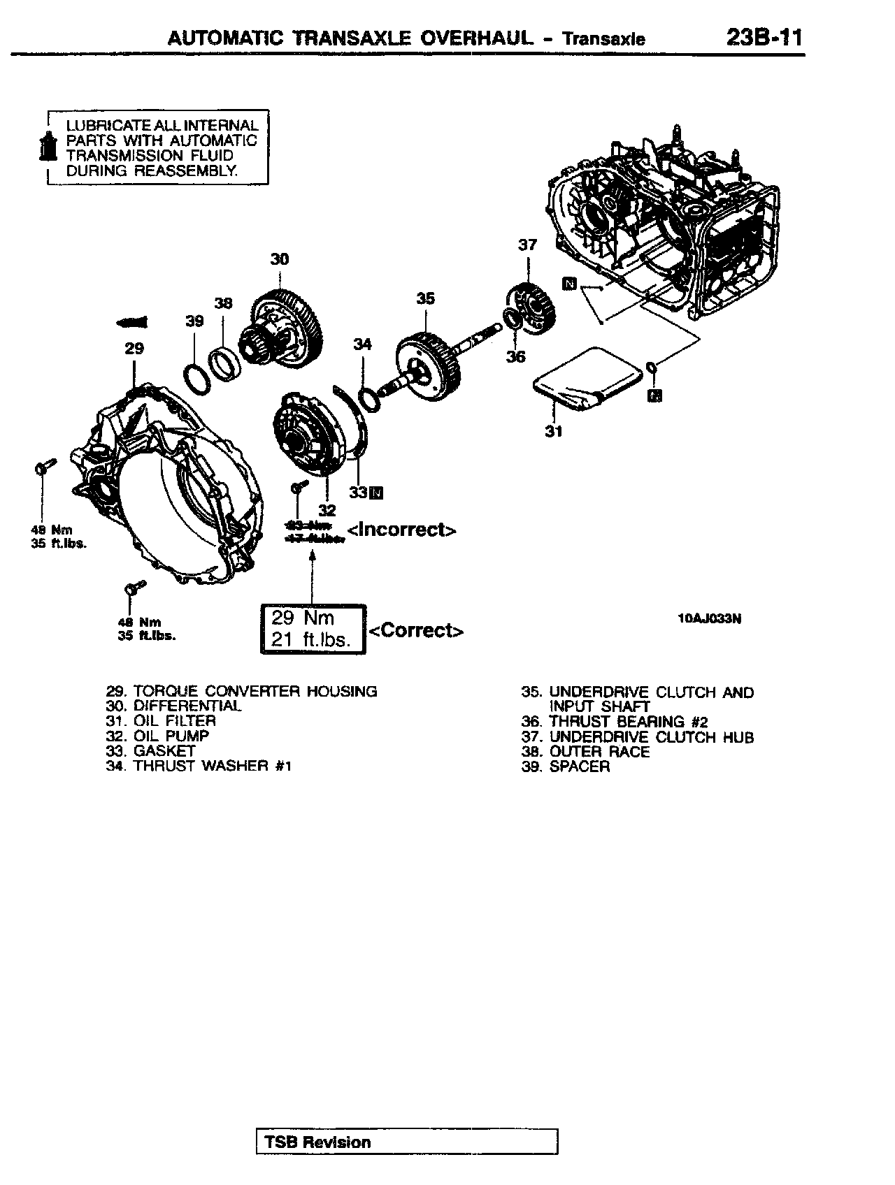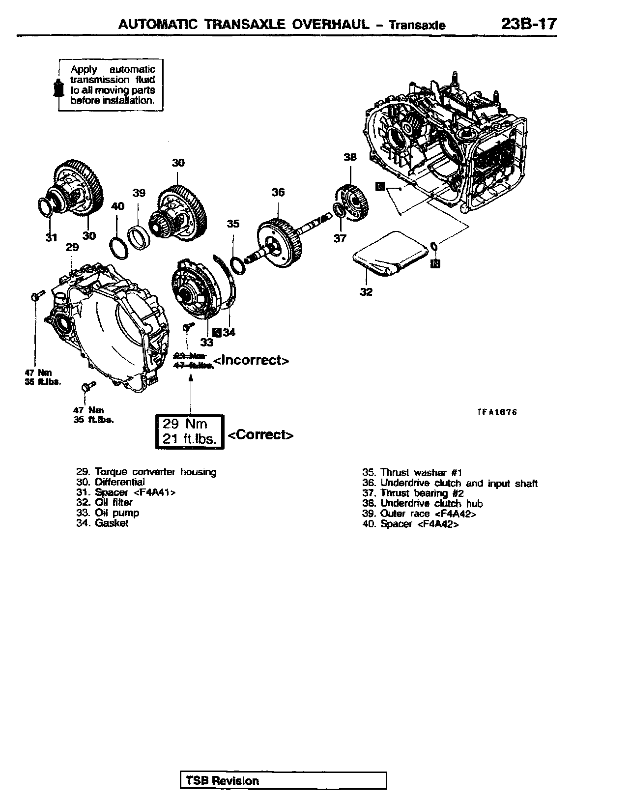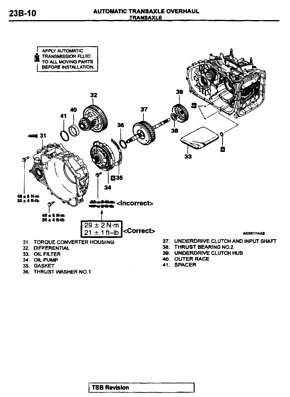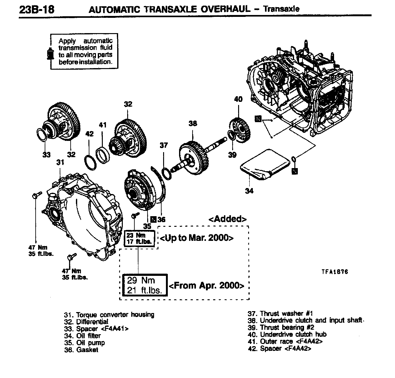 This bulletin revises the tightening torque values for the transmission output shaft retainer bolts and the transmission oil pump mounting bolts. These torque values were changed beginning with April, 2000 production.