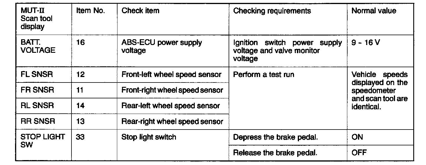 DATA LIST REFERENCE TABLEThe following items can be read by the scan tool from the ABS-ECU input data.
