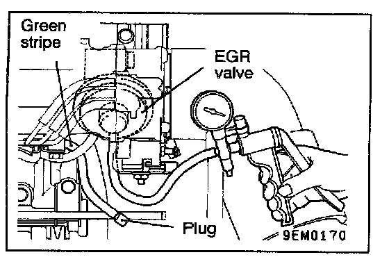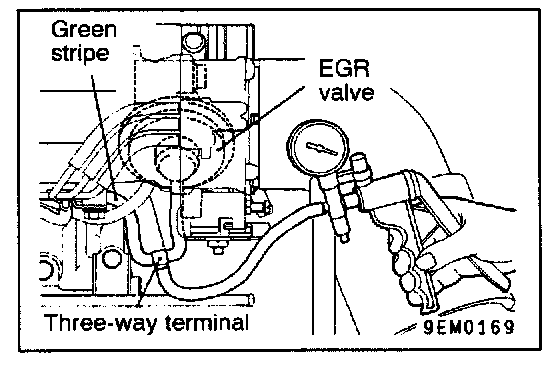 1. Disconnect the vacuum hose (green stripe) from the EGR valve, and then connect a hand vacuum pump via the three-way terminal.