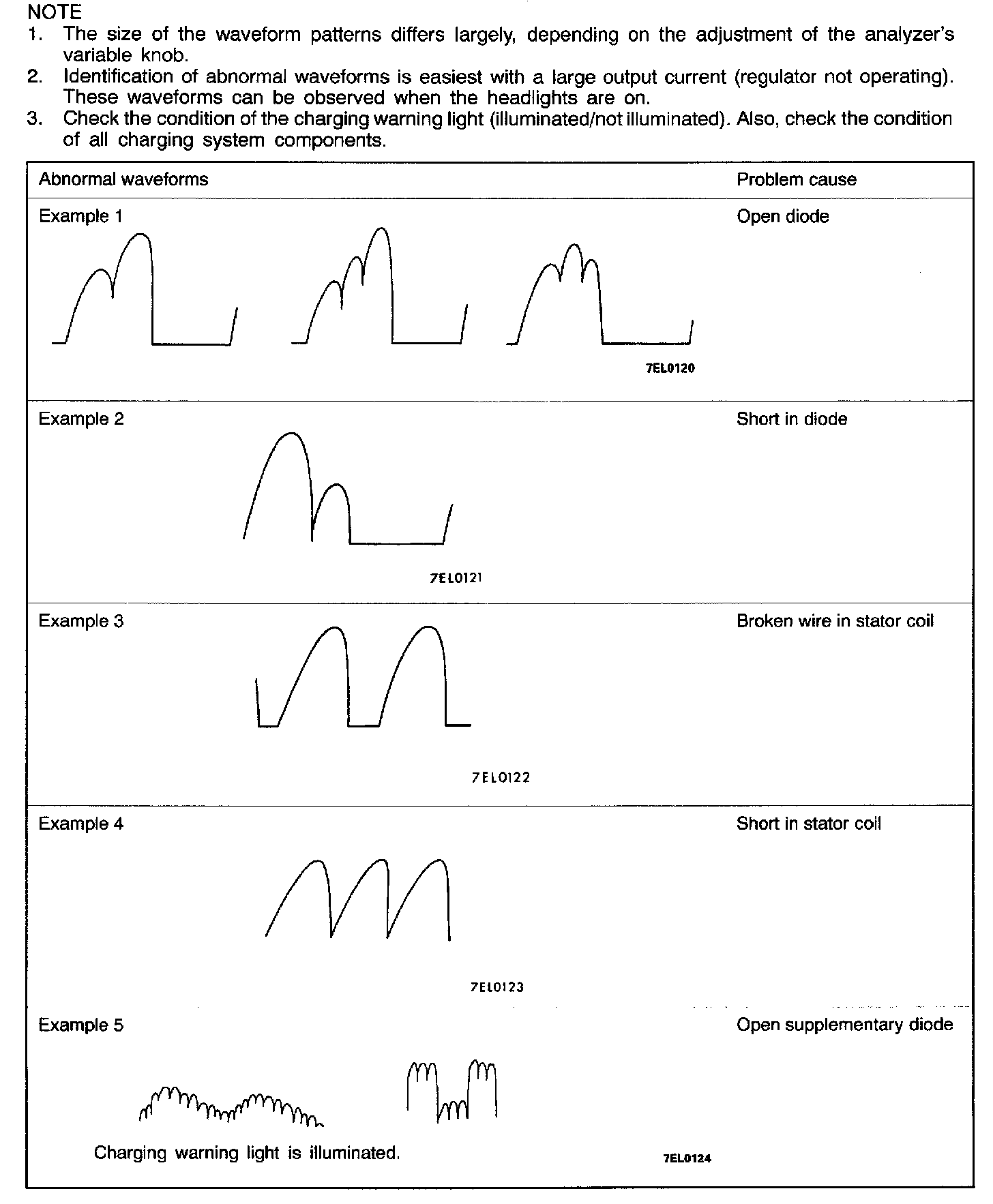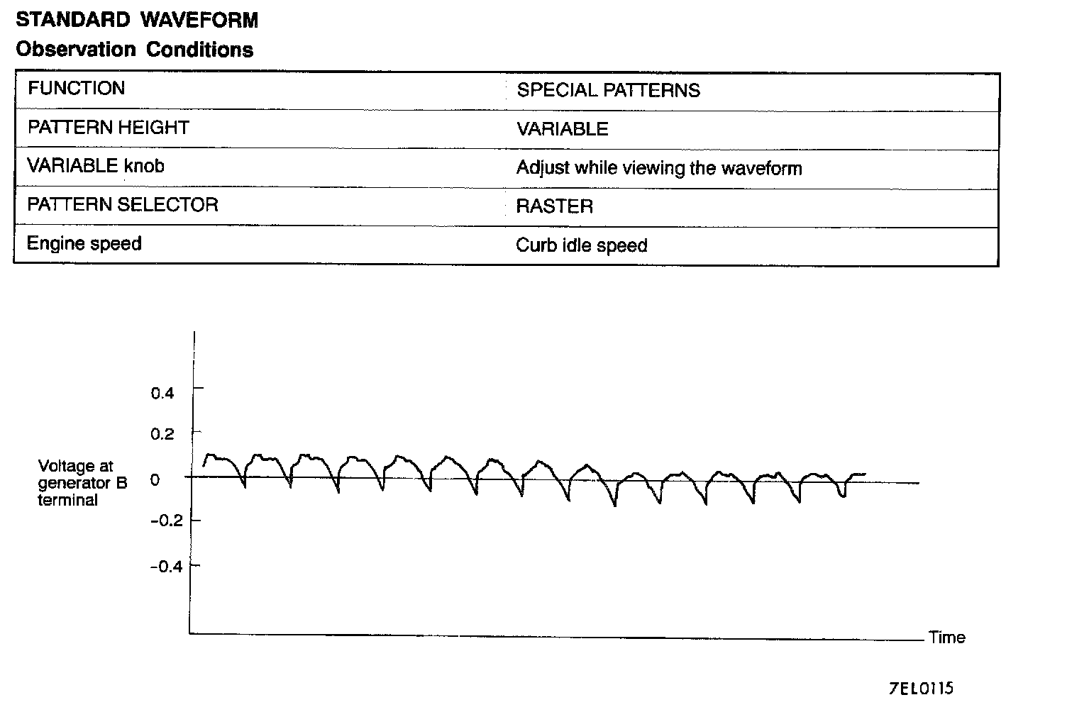 NOTE: The voltage waveform of the generator B terminal can undulate as shown. This waveform is produced when the regulator operates according to fluctuations in the generator load (current), and is normal for the generator.