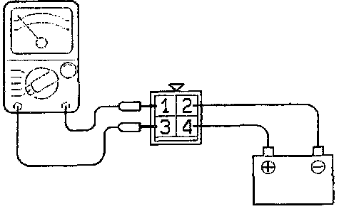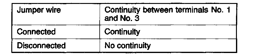 3. Check the continuity between the terminal (1) and the terminal (3) of the A/T control relay when the jumper wires are connected to and disconnected from the battery.