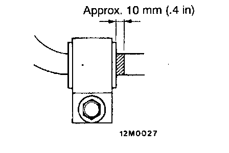 Place the identification mark of the stabilizer bar to the left, and install the bushing so that the identification mark protrudes approximately 10 mm (0.4 inch) from the edge of the inside of the bushing.