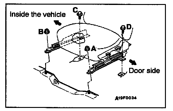 Tighten the front seat mounting bolts in the order A, B, C, and D.