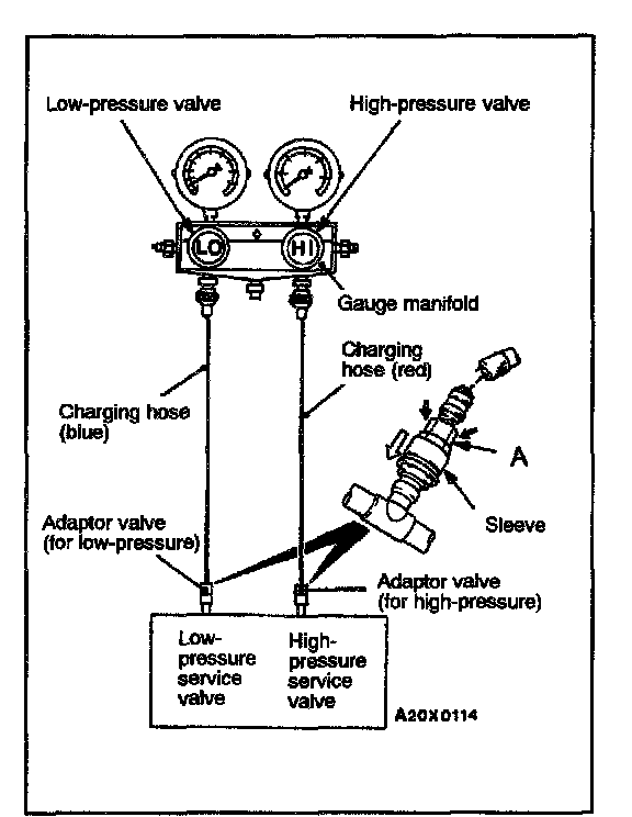 NOTE: The high-pressure service valve is on discharge pipe B, and the low-pressure service valve is on the suction hose.