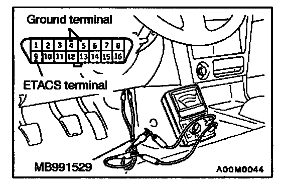 1. Use the special tool to connect a voltmeter between the ground terminal and the ETACS terminal of data link connector.