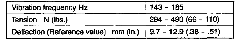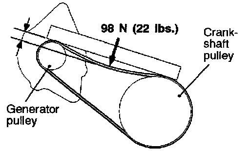Apply 98 N (22 lbs.) of force to the middle of the drive belt between the pulleys (at the place indicated by the arrow) and check that the amount of deflection is within the standard value range.