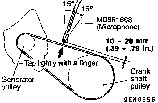 4. Hold the microphone to the middle of the drive belt between the pulleys (at the place indicated by an arrow) about 10 - 20 mm (0.39 - 0.79 inch) away from the rear surface of the belt and so that it is perpendicular to the belt (within an angle of ± 15°).