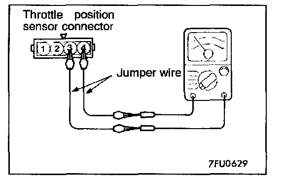 2. Connect an ohmmeter between terminal 3 (closed throttle position switch) and 4 (sensor ground) by using jumper wires.